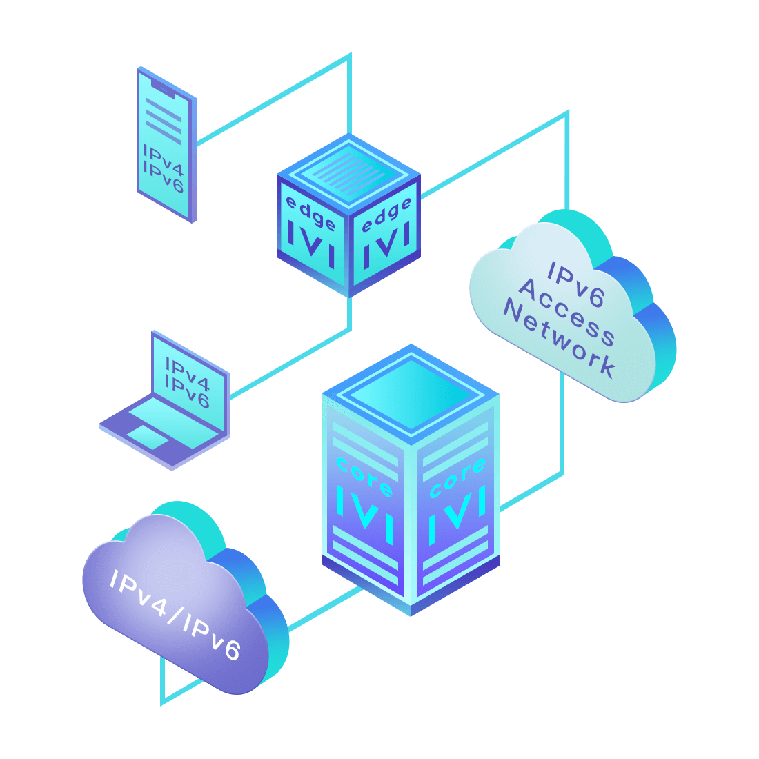 對正在進行IPv6整體升級規(guī)劃的運營商,應用IPv6升級方案2.5,通過IVI無狀態(tài)翻譯技術和純IPv6接入網(wǎng)絡,為雙棧客戶端和雙棧服務器提供連通服務。